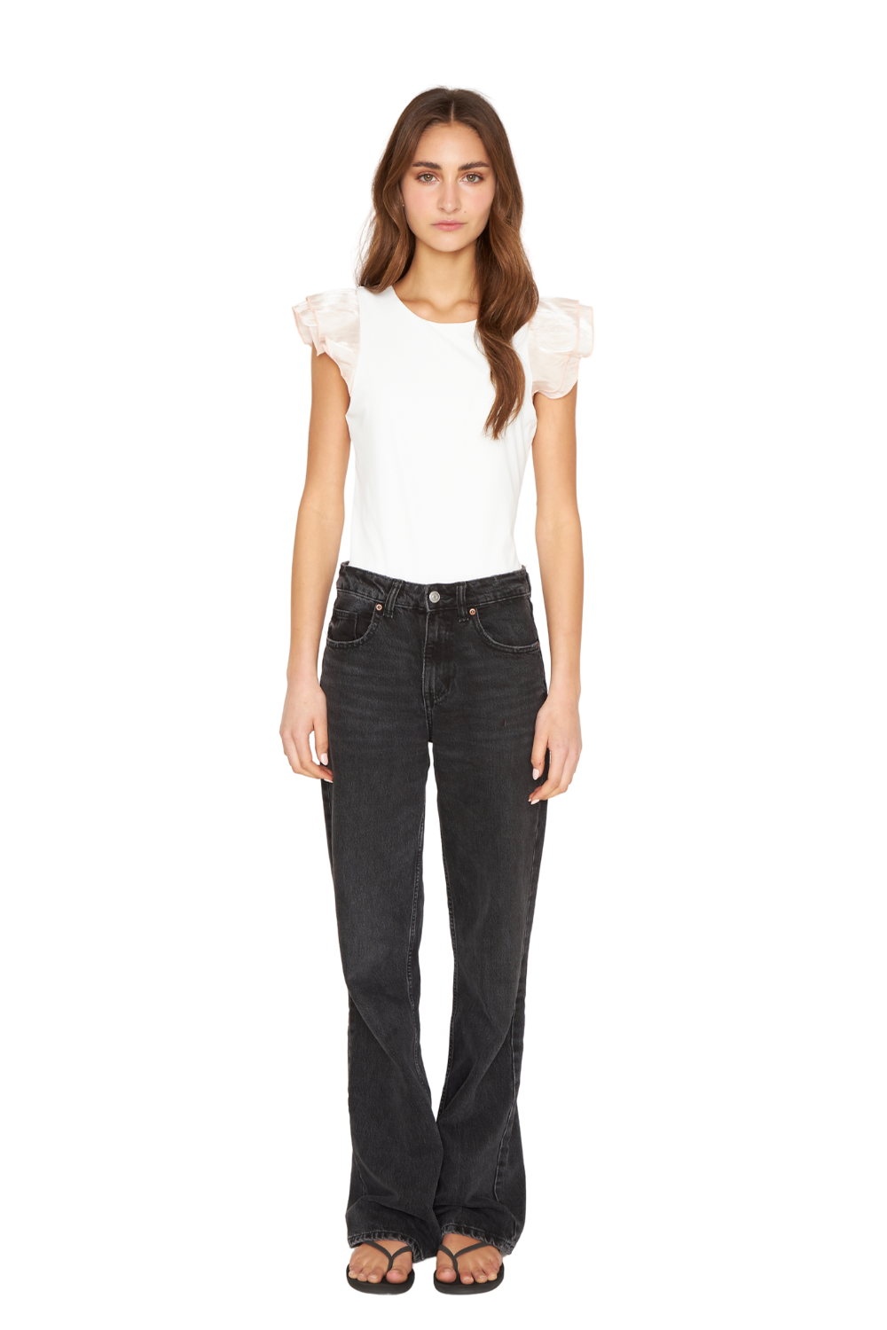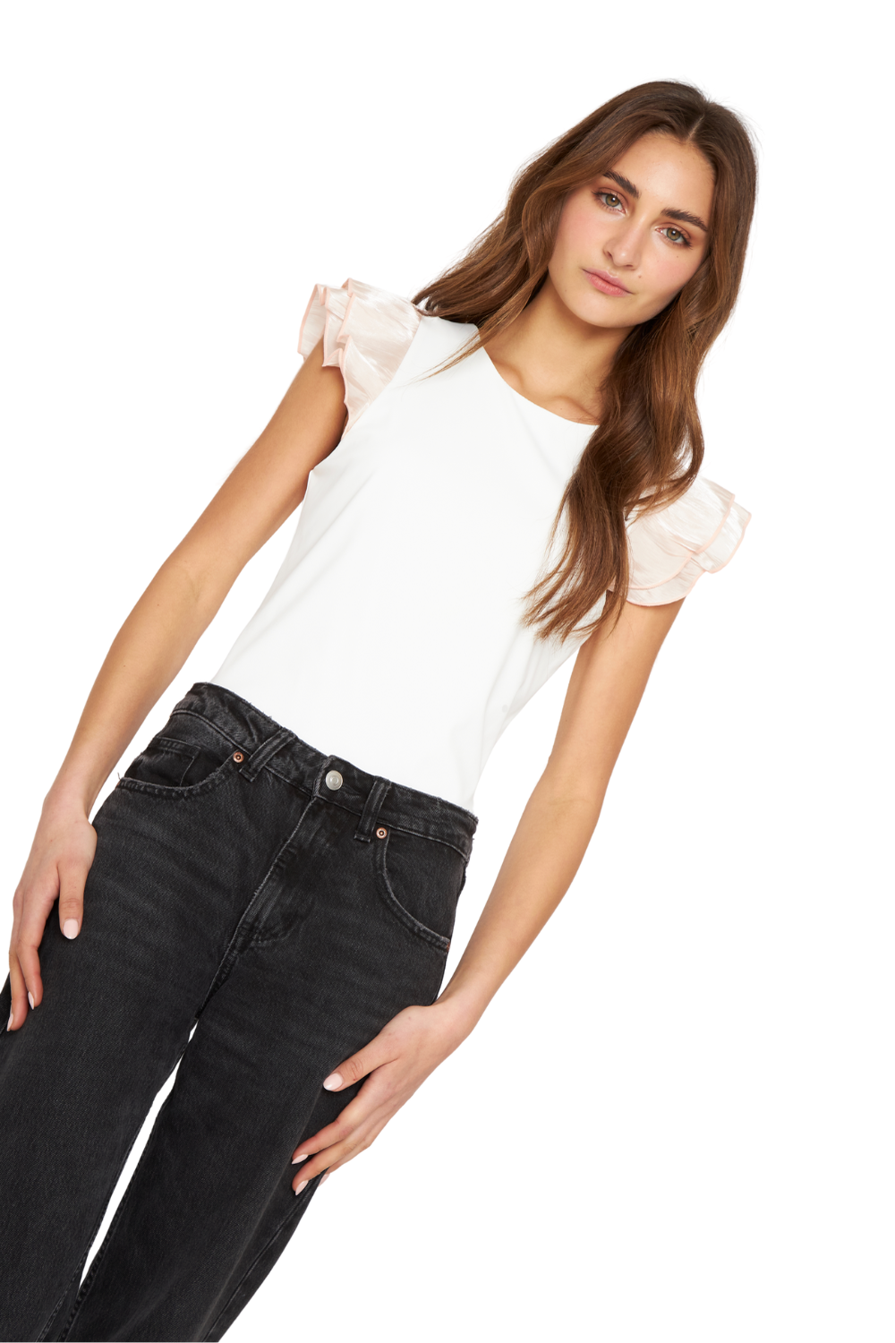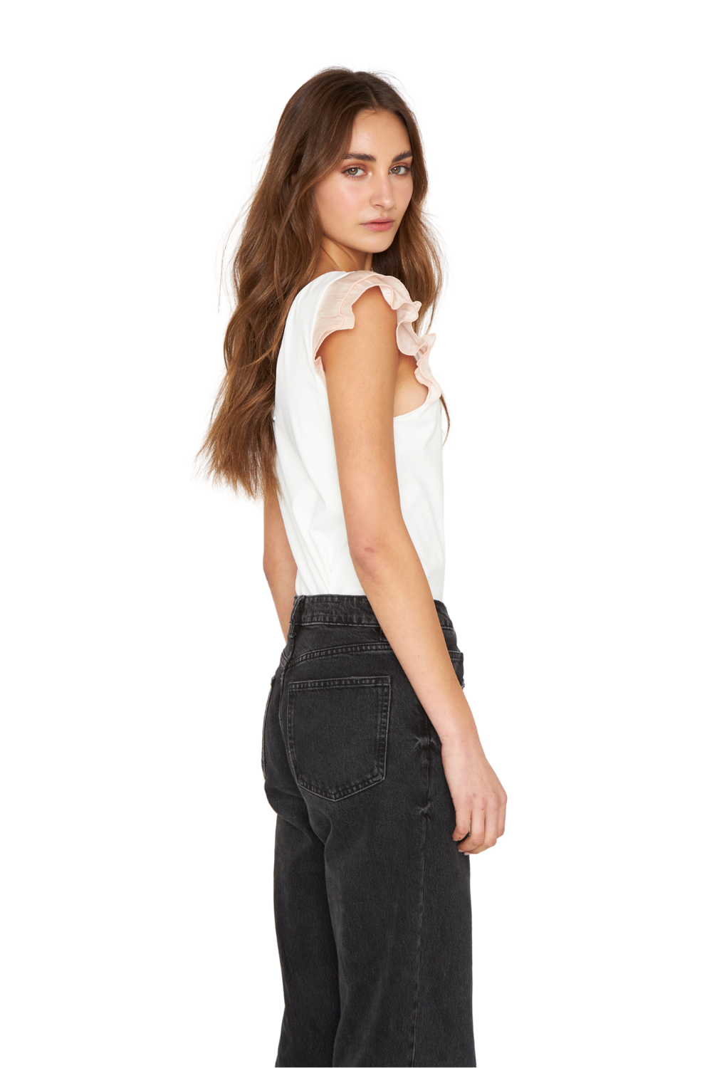 DESCRIPCIÓN: Body con mangas tipo alitas (tela semibrillante) doble vuelo en los hombros, cuello redondo CALCE: Ajustado