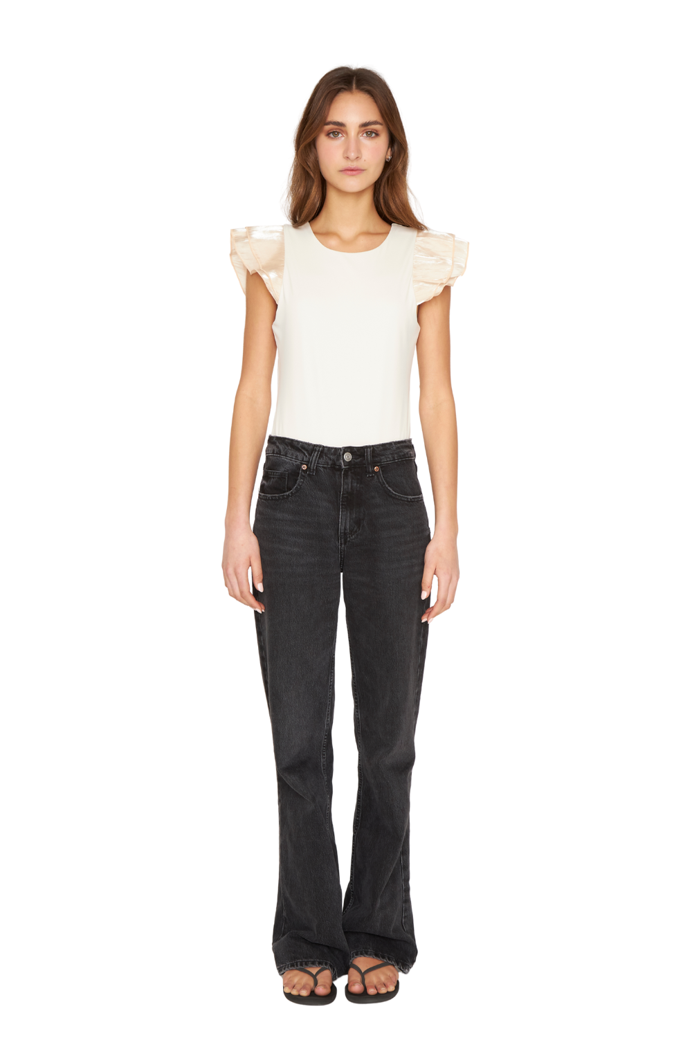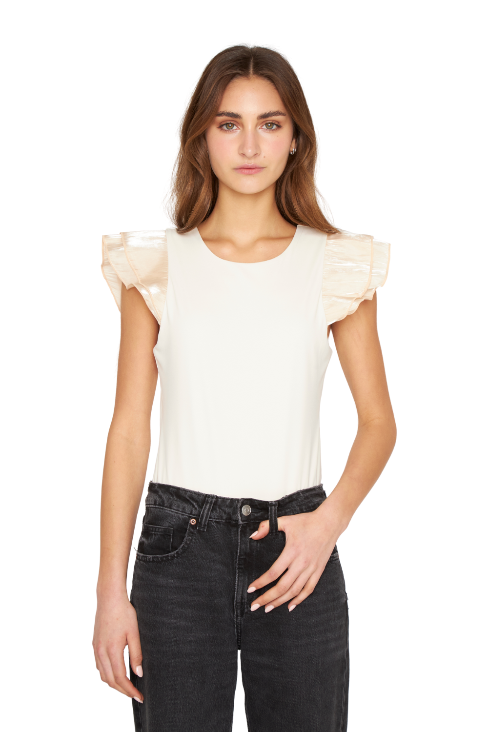 DESCRIPCIÓN: Body con mangas tipo alitas (tela semibrillante) doble vuelo en los hombros, cuello redondo CALCE: Ajustado