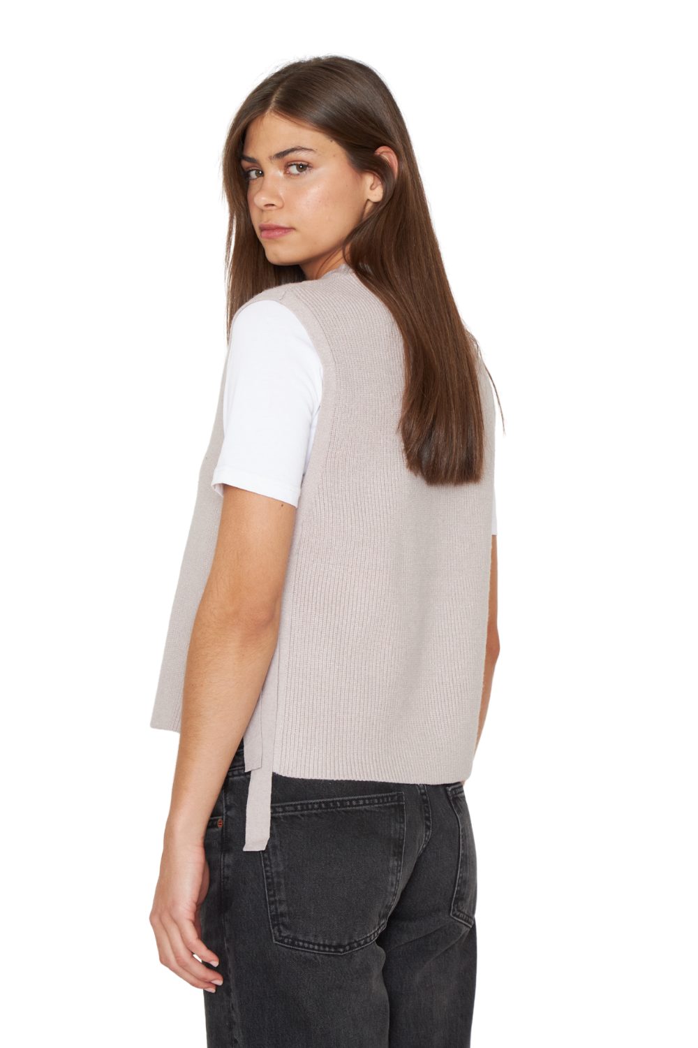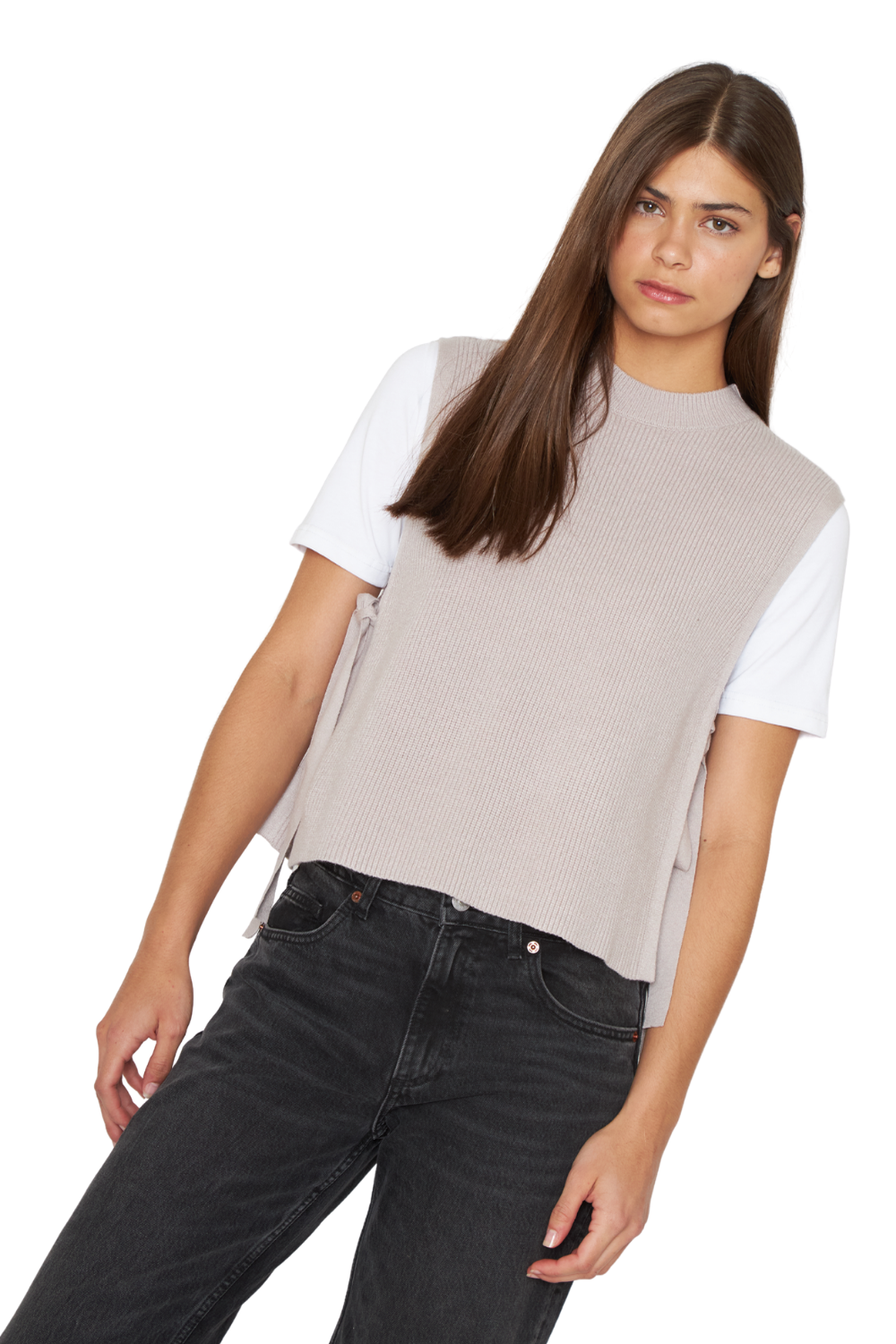 DESCRIPCIÓN: Chaleco cerrado sin mangas anudado en los costados, tejido grosor medio