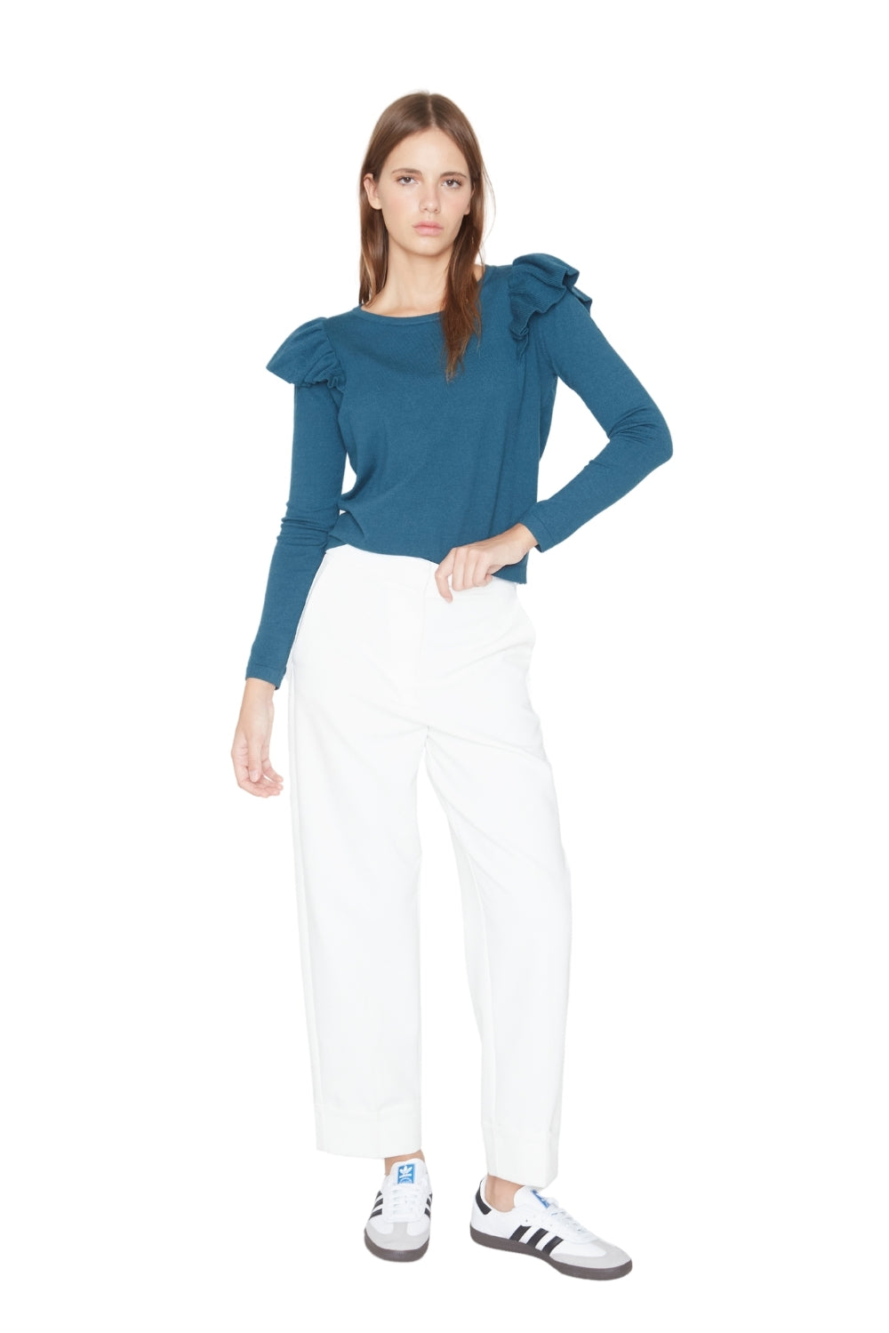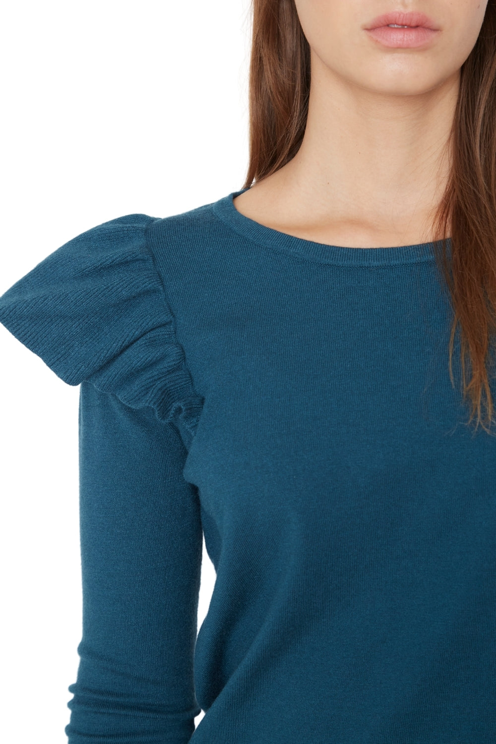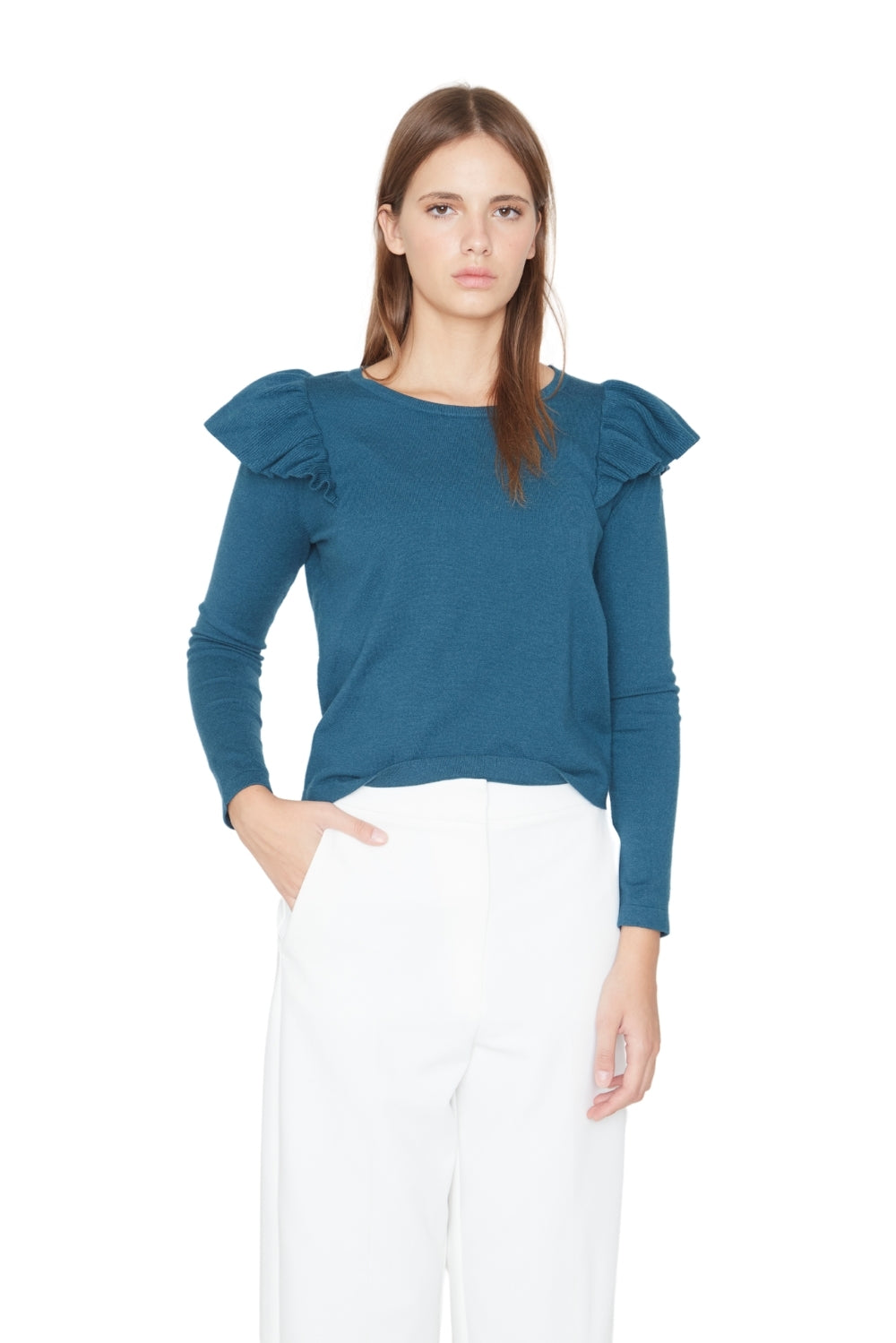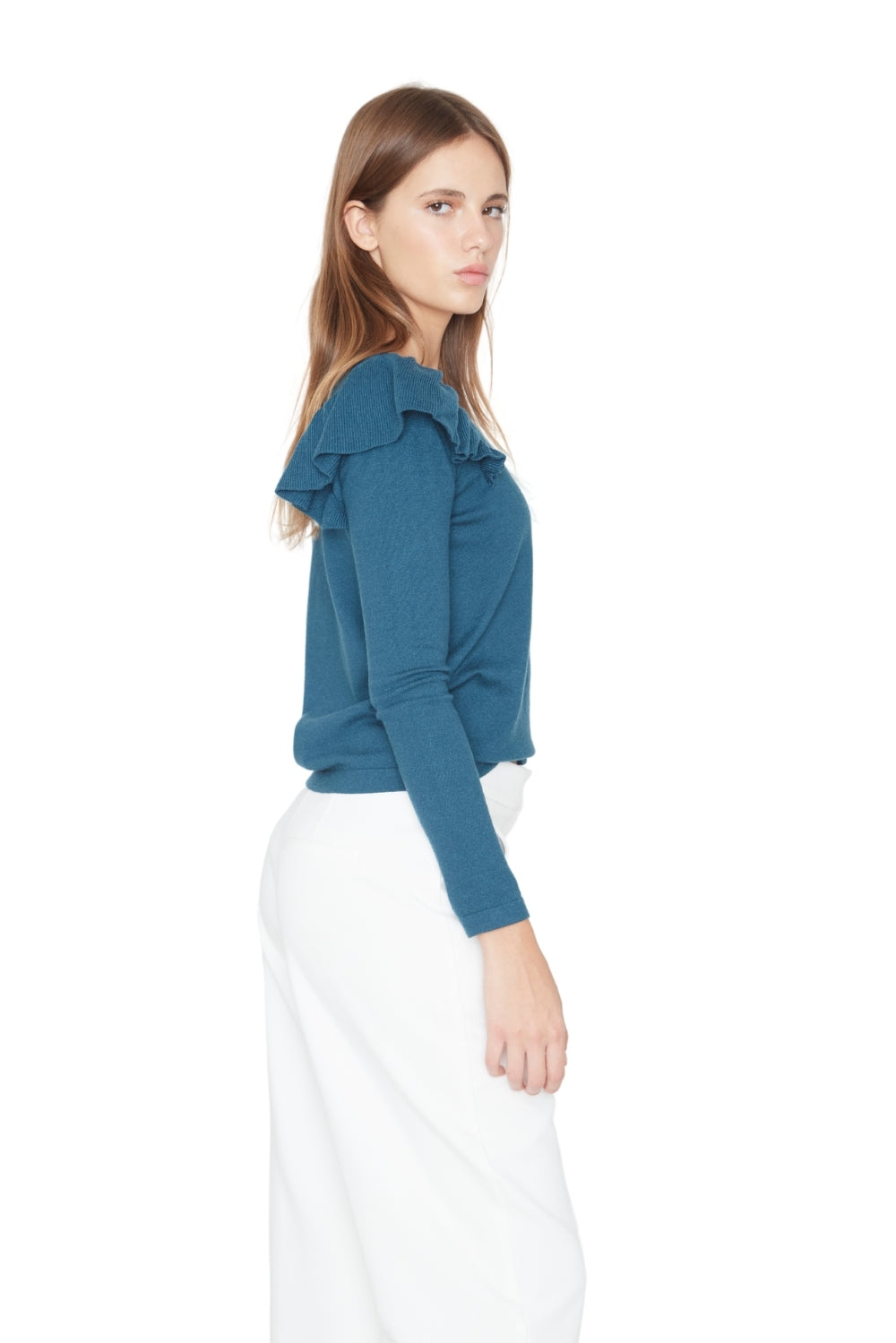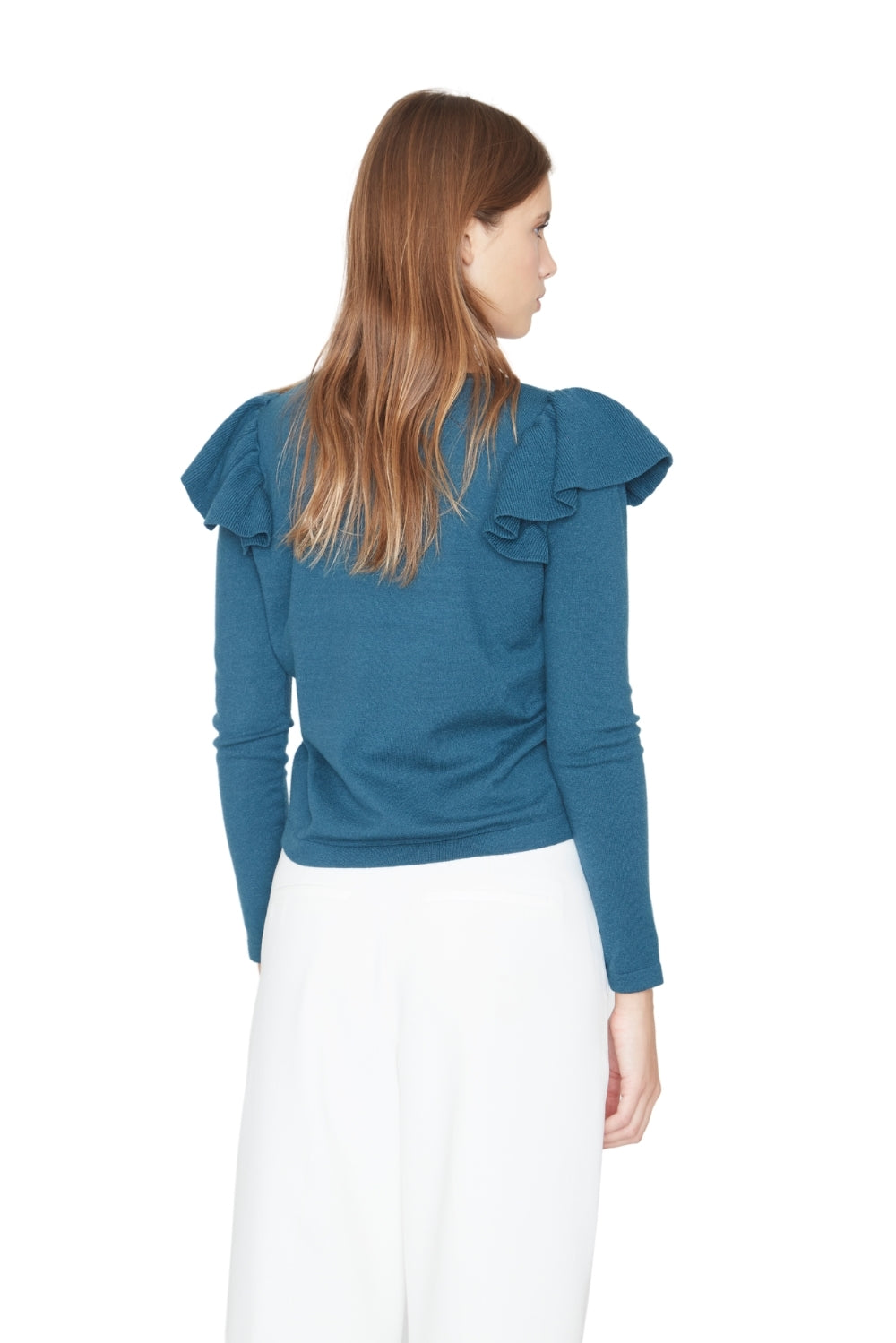 DESCRIPCIÓN: Chaleco cerrado cuello redondo con vuelos tipo alitas, tejido grosor medio