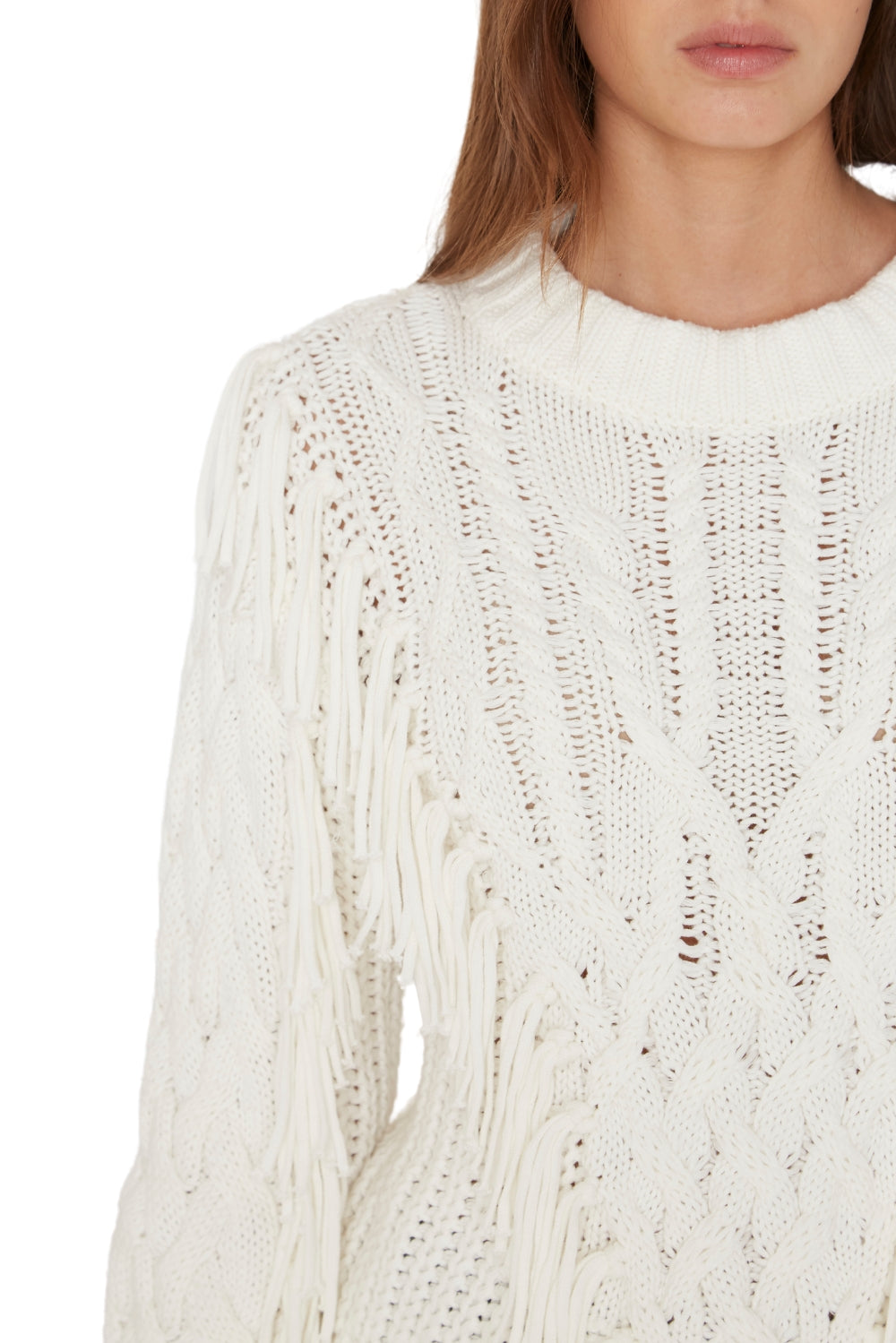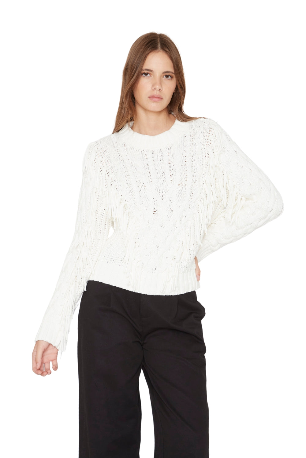 DESCRIPCIÓN: Chaleco cerrado trenzado con flecos frontales, cuello midi, tejido grueso