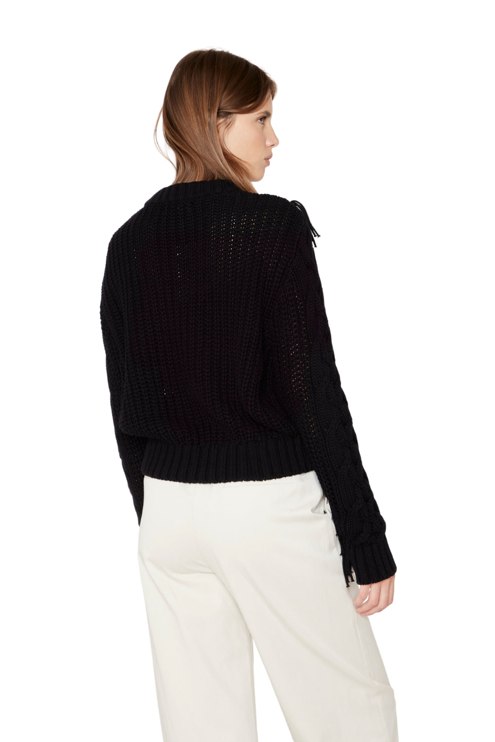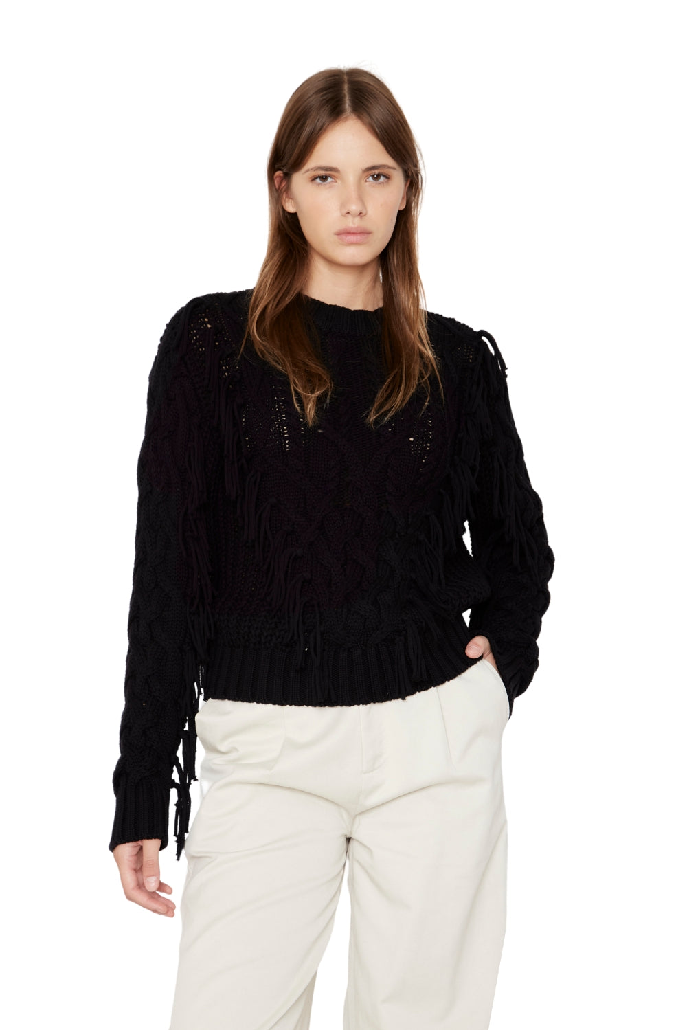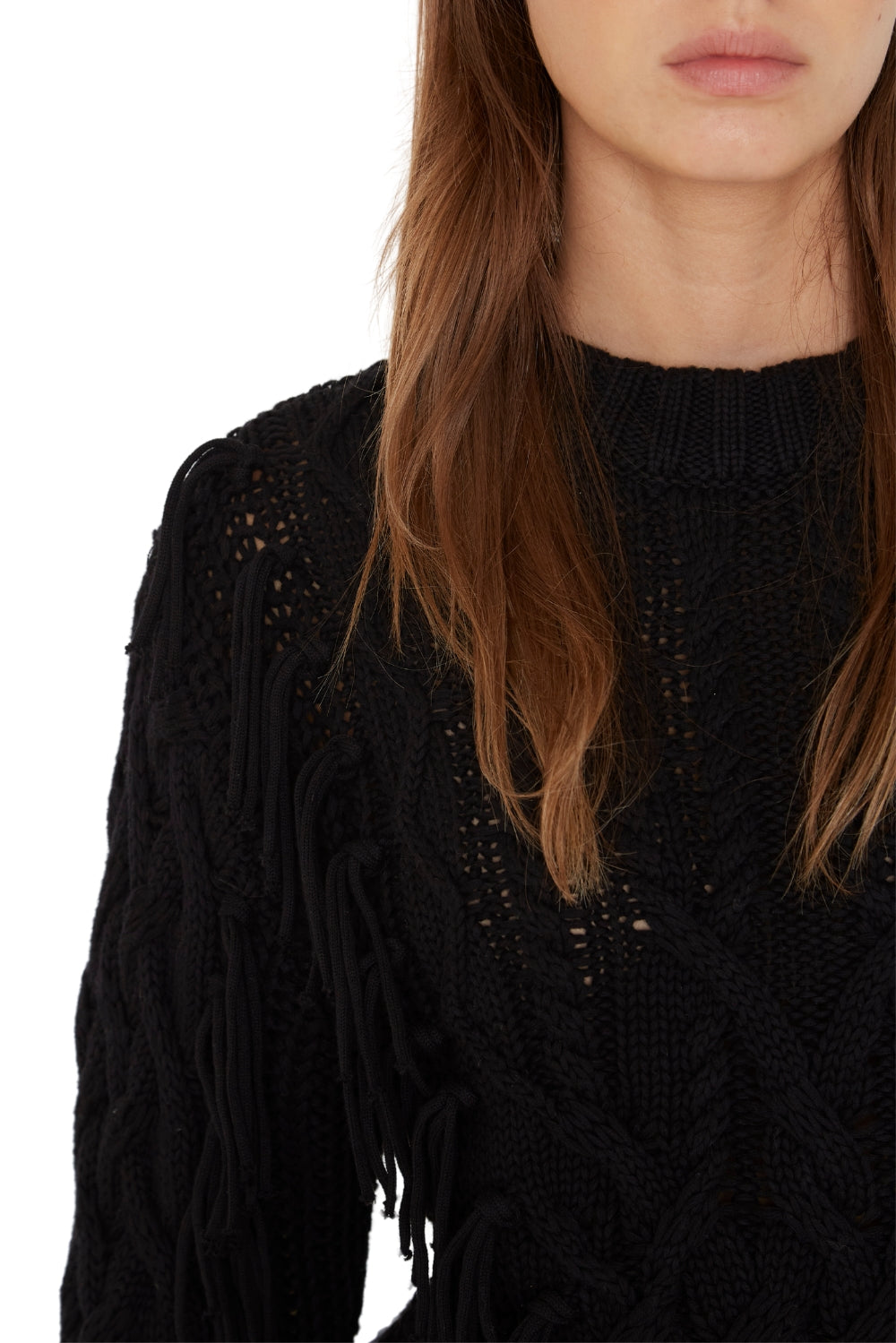 DESCRIPCIÓN: Chaleco cerrado trenzado con flecos frontales, cuello midi, tejido grueso