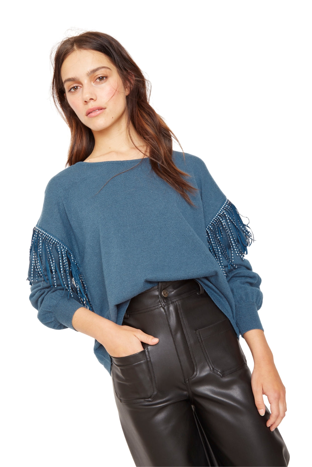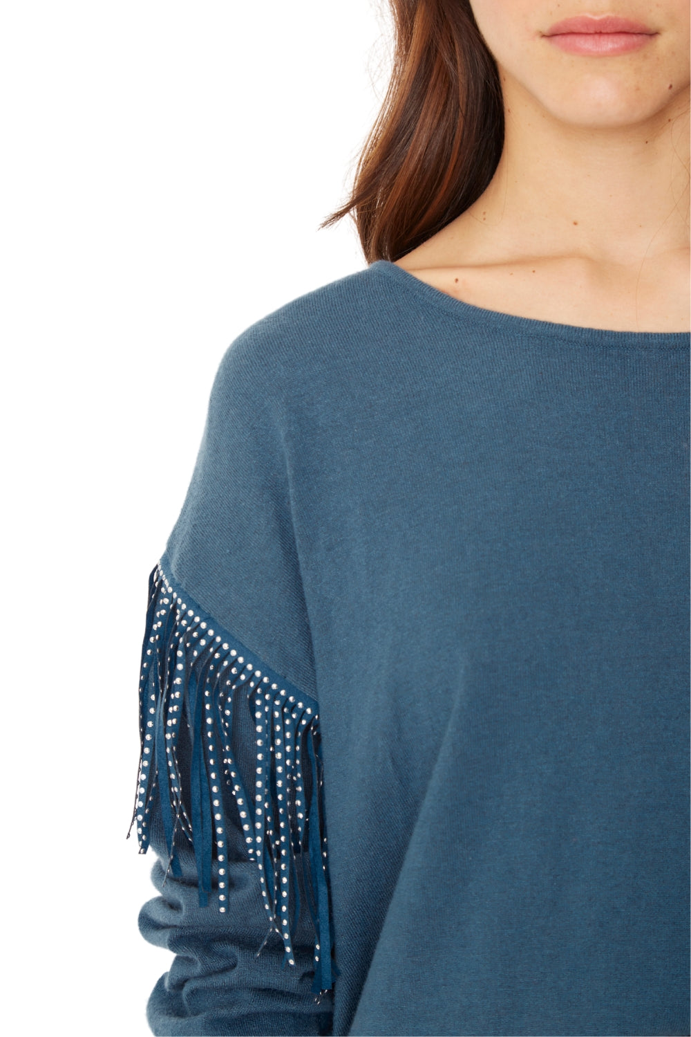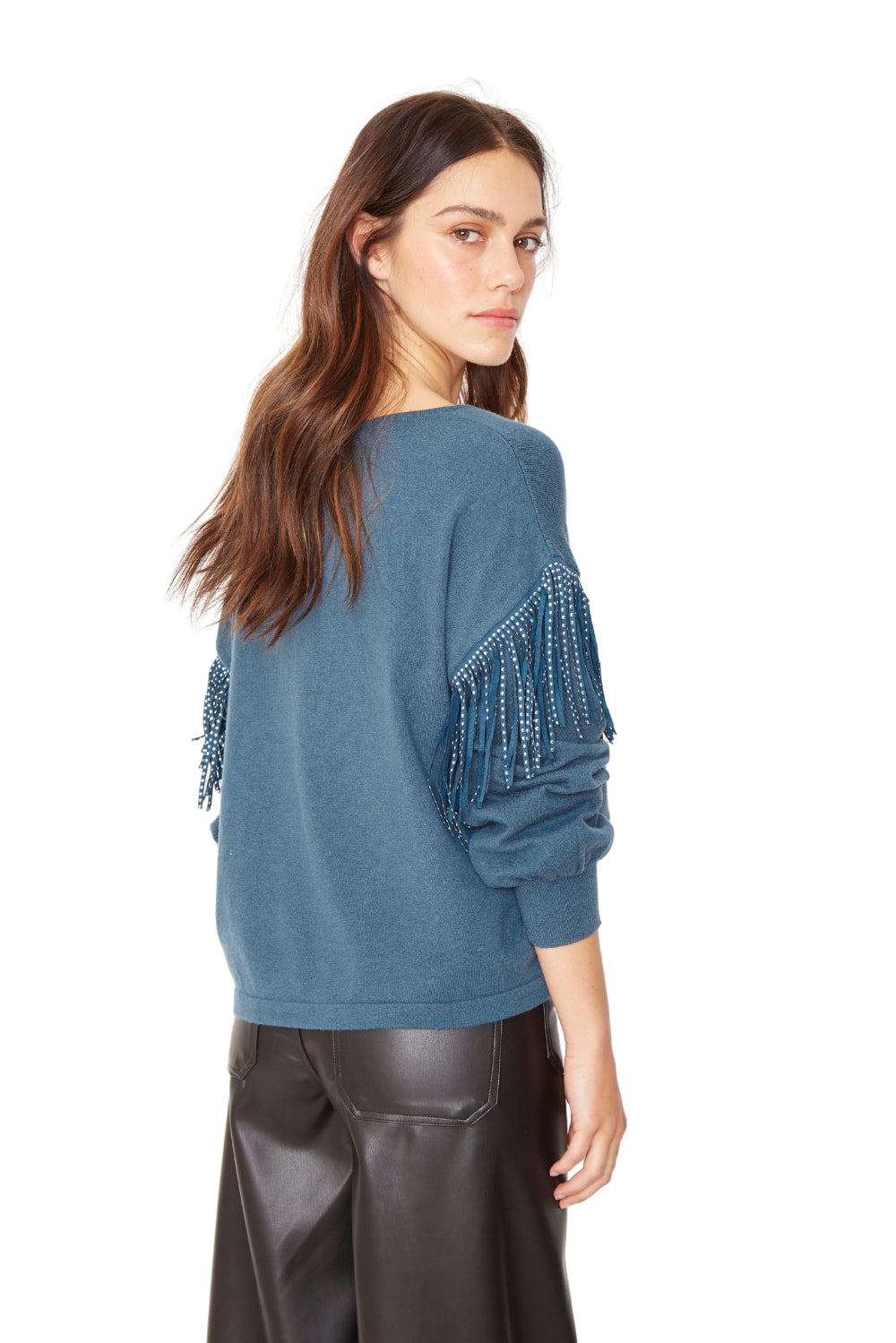 DESCRIPCIÓN: Chaleco cerrado cuello redondo con flecos con tachas en las mangas, tejido grosor medio