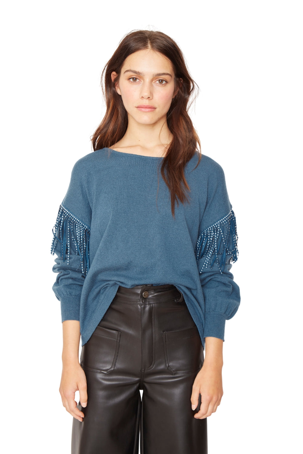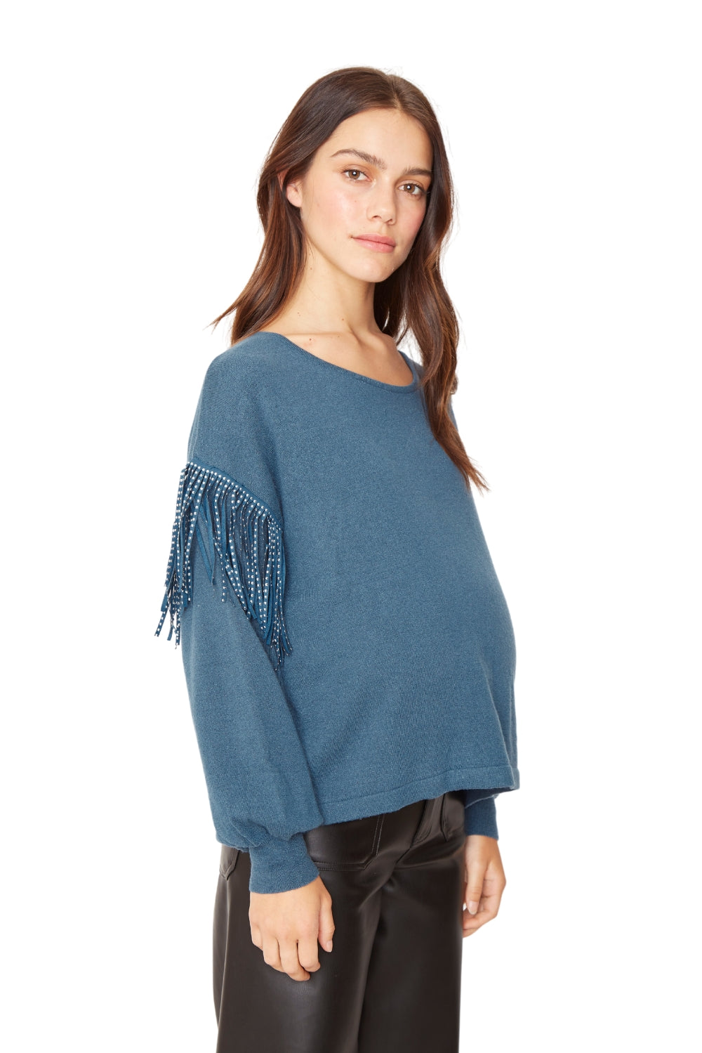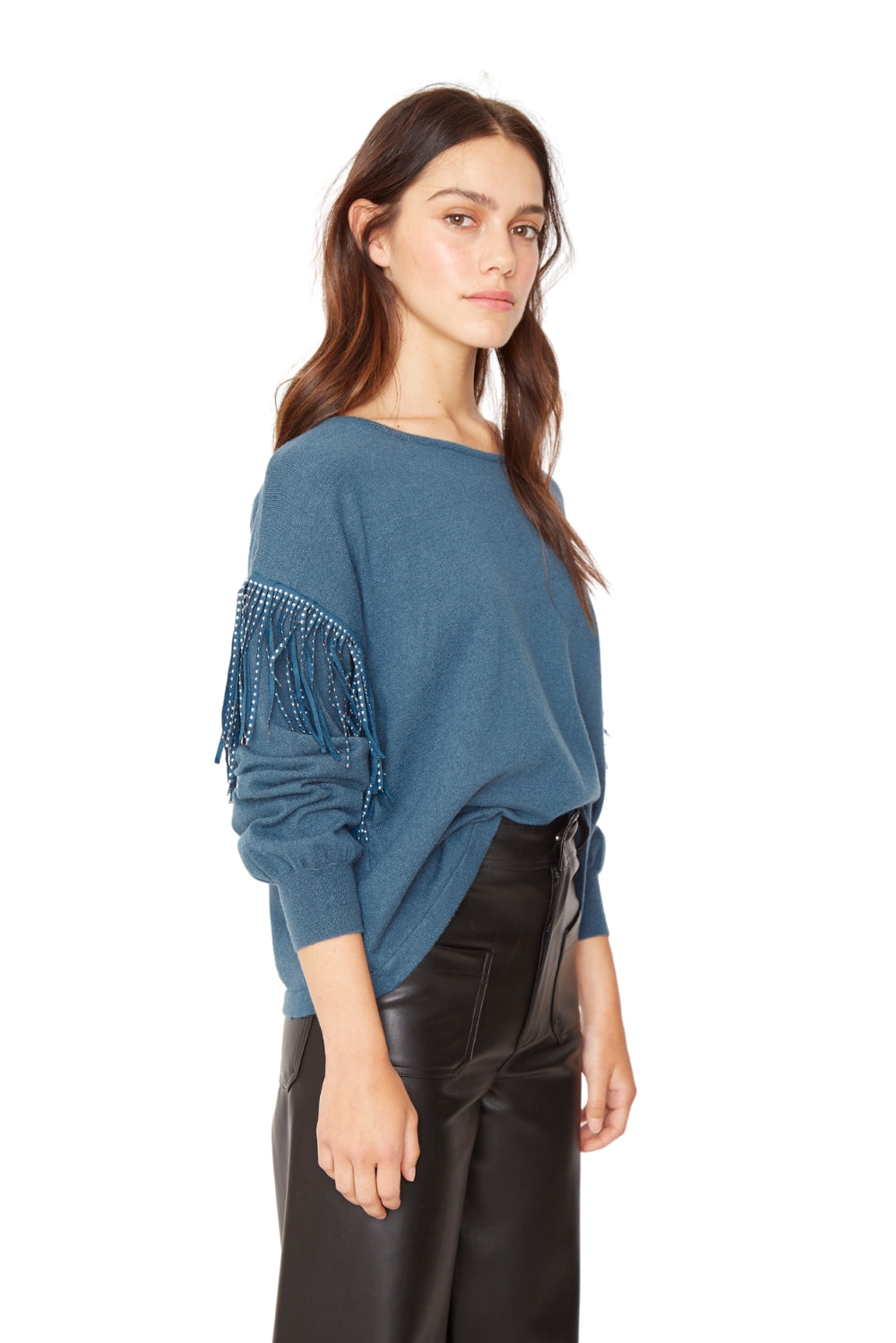 DESCRIPCIÓN: Chaleco cerrado cuello redondo con flecos con tachas en las mangas, tejido grosor medio