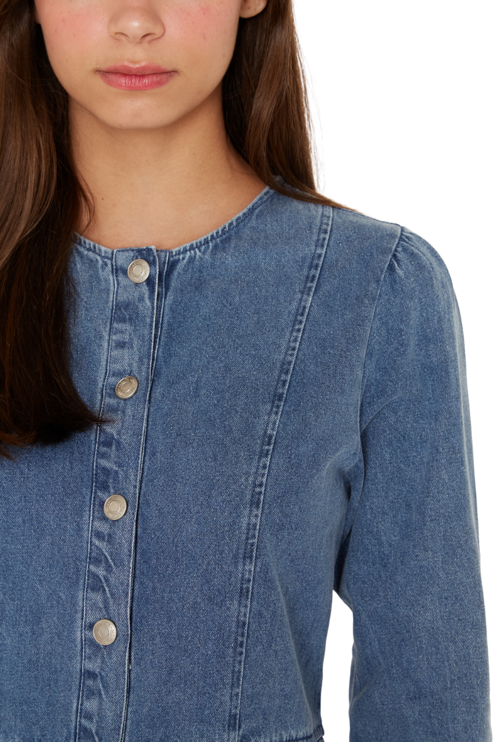 DESCRIPCIÓN: Vestido abotonado con corte en la cintura, bolsillos funcionales y botones en el puño de la manga, denim grosor medio