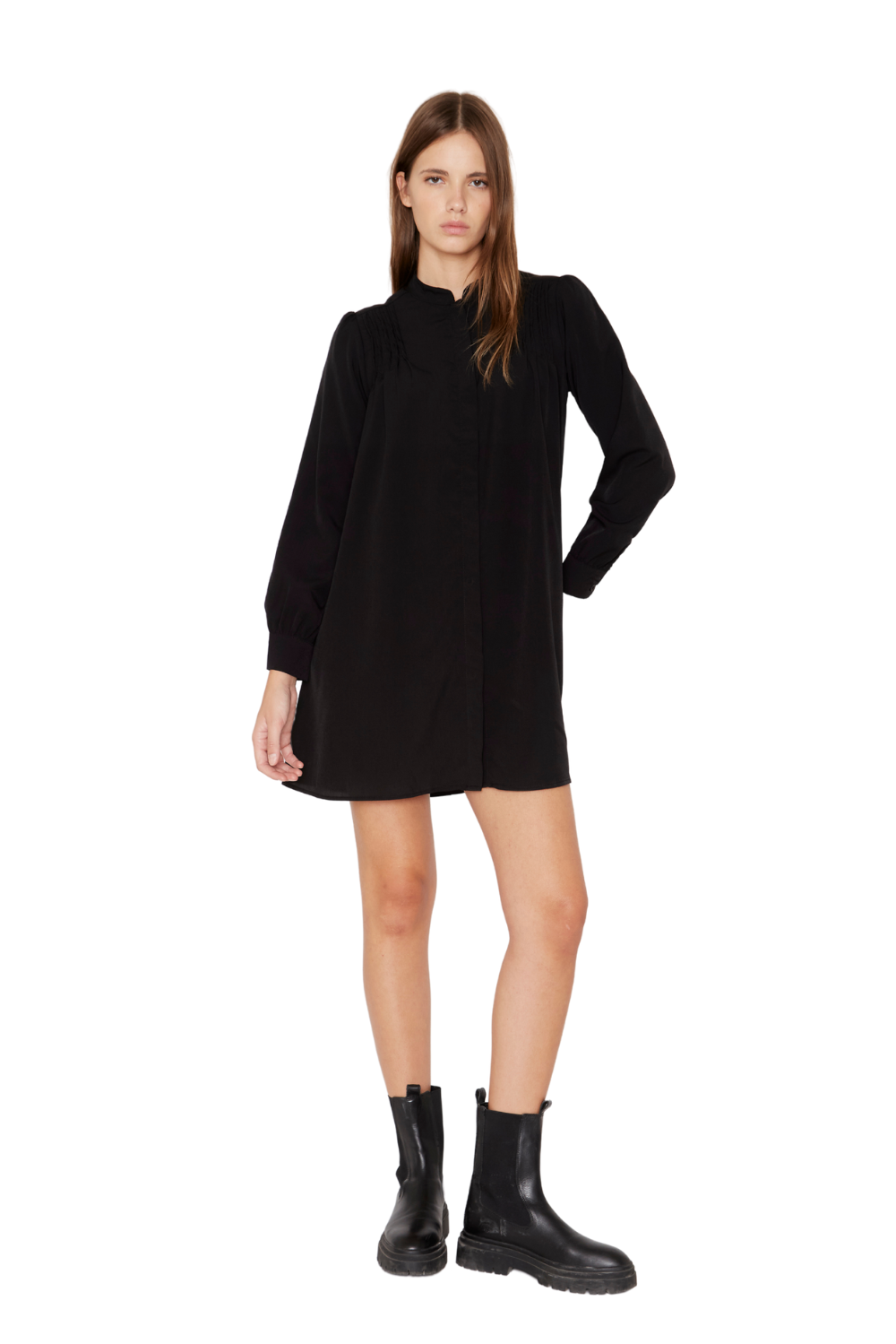 DESCRIPCIÓN: Vestido abotonado cuello en v tipo mao con botón en el puño de la manga y lazo anudable en la cintura